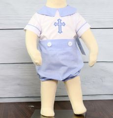 Outfit your adorable baby boy for his very special day in one of our baby boy baptism outfit. Christening outfits are handmade smocked in a fashionable Christian design. Fashioned in fine quality imperial broadcloth, you can choose your color for personalization or embroidered cross. Our heirloom quality baby boy baptism outfits for infants and toddler mark is baptismal day with a special meaning that will be passed down through the generations.
