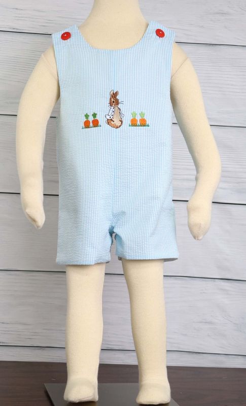 He will make a great first impression for his bunny birthday in a some bunny is one outfit and is perfect for a baby boy first birthday or an Easter photo outfit. Bunny birthday party outfit is a baby boy romper in cotton seersucker.