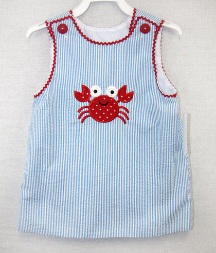 Baby girl jumper with applique is blue seersucker with applique crab, red rick rack and red buttons.