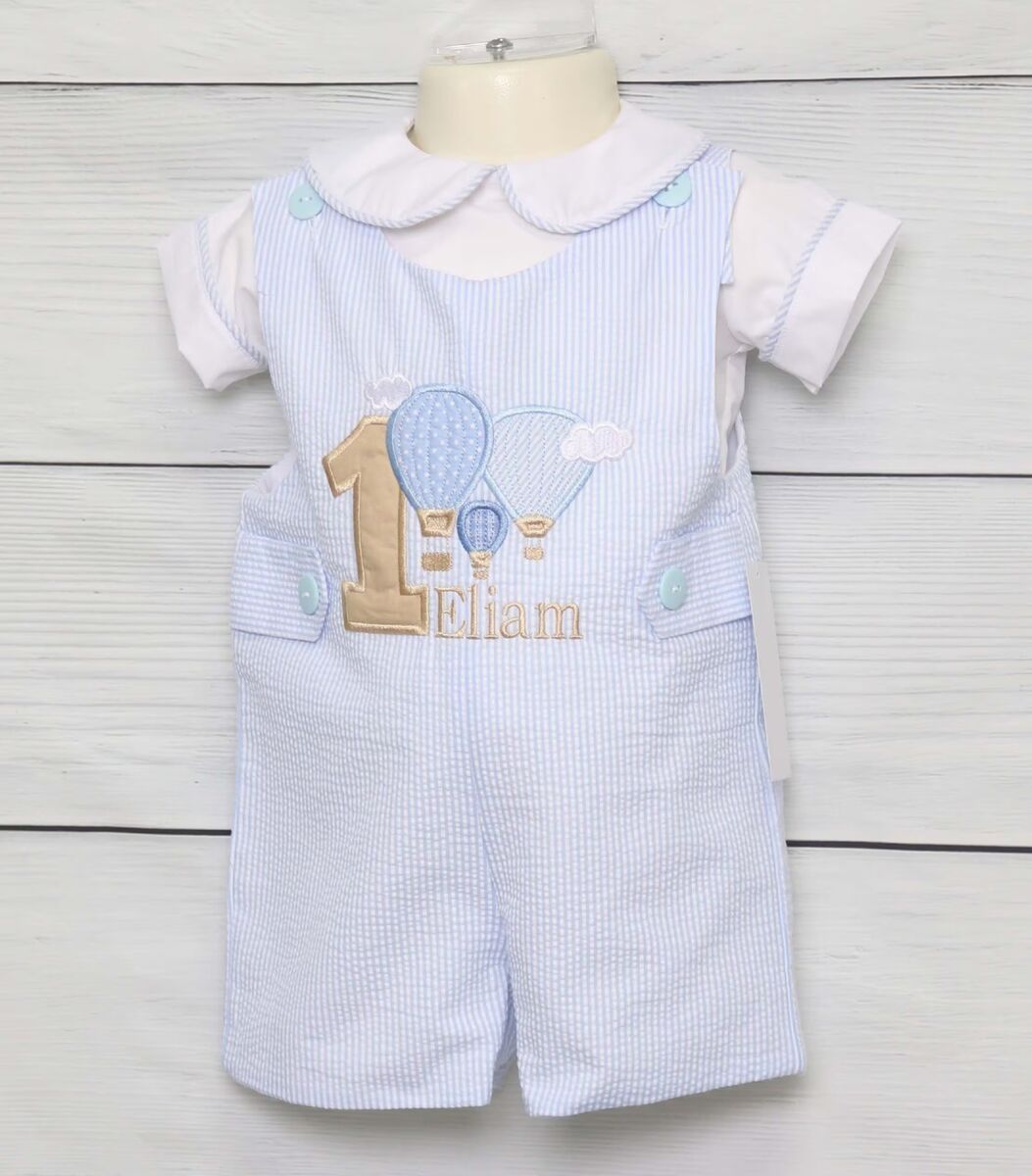 He will look amazing in a Hot Air Balloon Birthday Outfit for Boy by Zuli Kids. Boys first birthday outfit is blue stripe seersucker and is fully lined. Applique is hot air balloons. Can come in short or long (ankle length) pant and with or without monogram. To purchase shirt, click on link in product description.