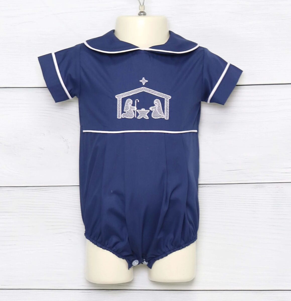 Show him off for the Holidays in style this season with a baby Christmas outfit for boy by Zuli Kids. Our adorable navy Toddler Boy Christmas Outfits are designed in classic boutique fashion and makes the perfect Baby First Christmas outfit. Each outfit can be ordered with Christmas Nativity only or personalized with collar monogram for a keepsake touch. Ideal for family gatherings, Christmas parties, or holiday photos, this outfit captures the magic of the season. Whether you’re shopping for Christmas Outfits for Toddlers, newborn Christmas outfits, or sibling Christmas outfits, this design blends timeless style and heirloom-quality charm.