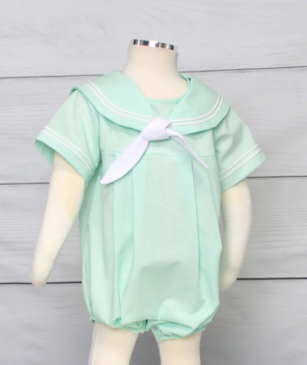 Baby Sailor Outfit designed for newborns, infants, and toddlers, this nautical baby boy sailor outfit by Zuli Kids is perfect for beach photos, birthday parties, baptisms, and summer celebrations. Made for families who love classic sailor styling with boutique craftsmanship, this outfit blends comfort with heirloom charm. What makes it unique is the adorable aqua bubble silhouette paired with crisp white sailor ties for a timeless nautical look that photographs beautifully.